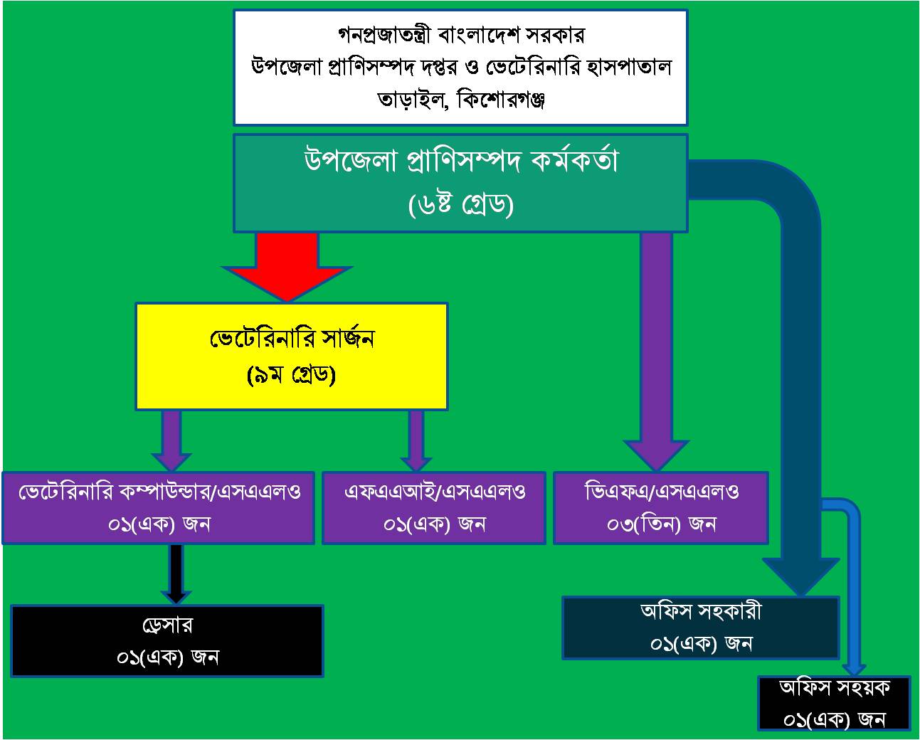 উপজেলা প্রাণিসম্পদ কর্মকর্তার অধীনে একজন ভেটেরিনারি সার্জন, একজন ভেটেরিনারি কম্পাউন্ডার, তিনজন ভিএফএ, একজন এফএ(এ/আই), একজন অফিস সহকারী কাম কম্পিউটার মুদ্রাক্ষরিক, একজন ড্রেসার এবং একজন অফিস সহায়ক রয়েছে।